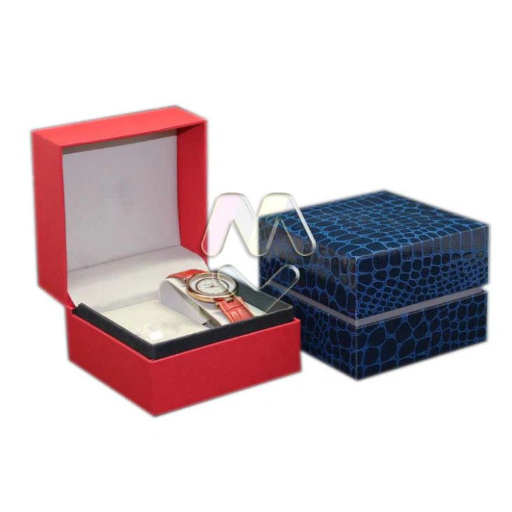 ఇది ప్రాథమికమైనదిపాపులర్ వాచ్ బాక్స్ఇప్పుడు వాచ్ ప్యాకేజింగ్ మార్కెట్, బ్లాక్ ప్లాస్టిక్ హింగ్డ్ బాక్స్ కేసు నుండి పొర మొసలి గ్రెయిన్ బ్లూ లెథెరెట్ పేపర్తో ముఖం మీద అతుక్కుంది,